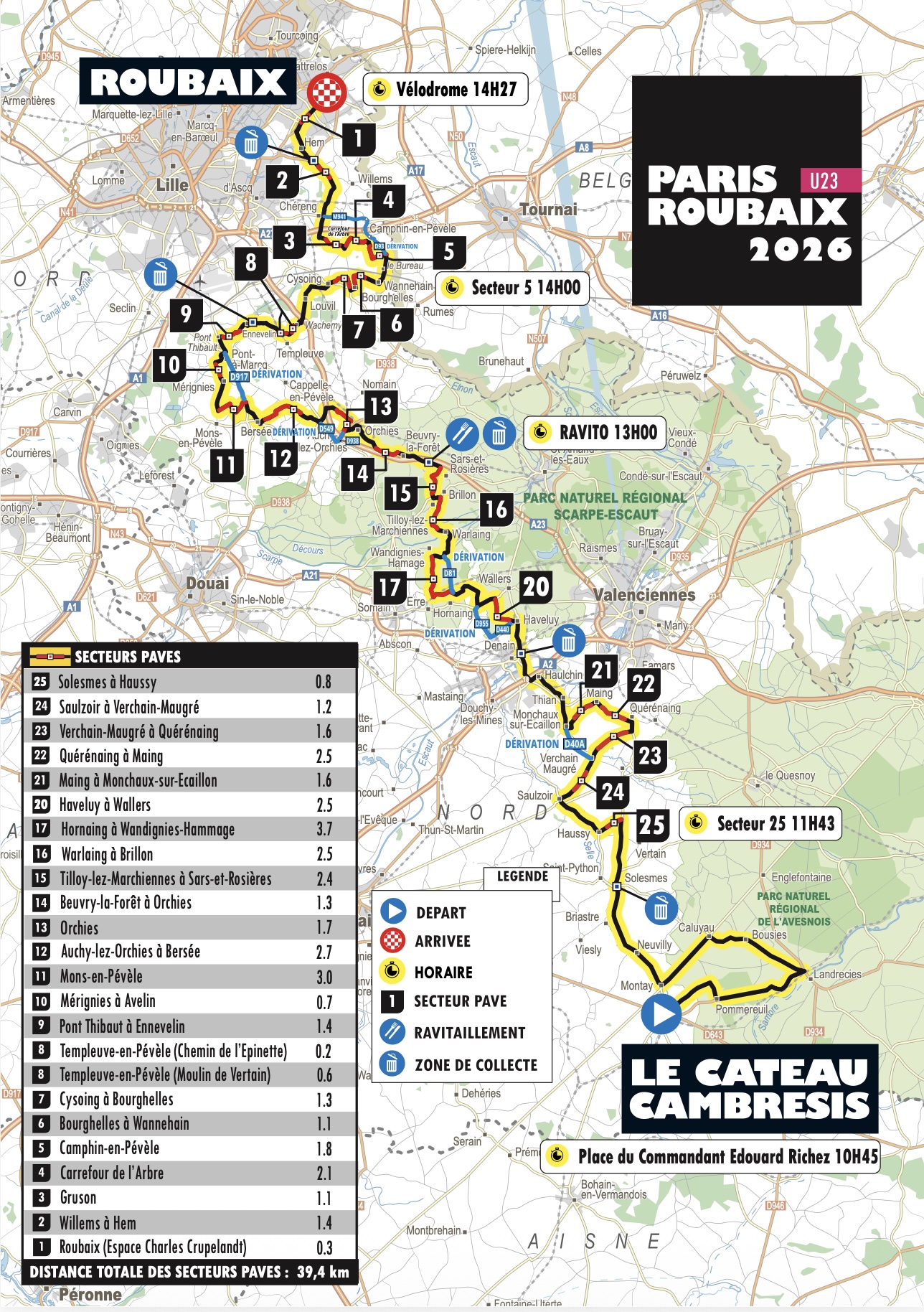 The U23 race joins the elite route before sector 25, using the same cobbled sectors from sector 25 onward — but skipping sectors 19 (Trouée d’Arenberg) and 18 (Wallers à Hélesmes). Also skips the first 5 elite sectors near Troisvilles/Briastre.